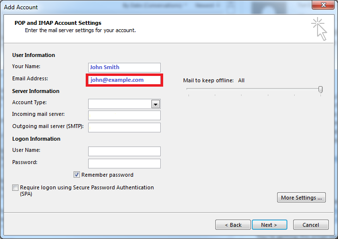 8. Enter the incoming and outgoing mail servers (SMTP) field