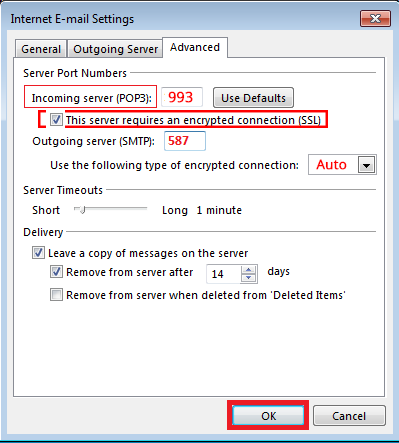 For Incoming server (POP3) enter 110 and in the Outgoing server (SMTP) enter the number 587, then click Ok