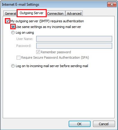 10. Select the Outgoing Server tab, select My outgoing server (SMTP) requires authentication and Use same settings as my incoming mail server