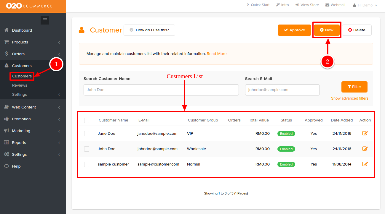 If you happen to have customers placing orders through you and not through your online store, you can manually create the customers accounts for them. To create a customer account,
