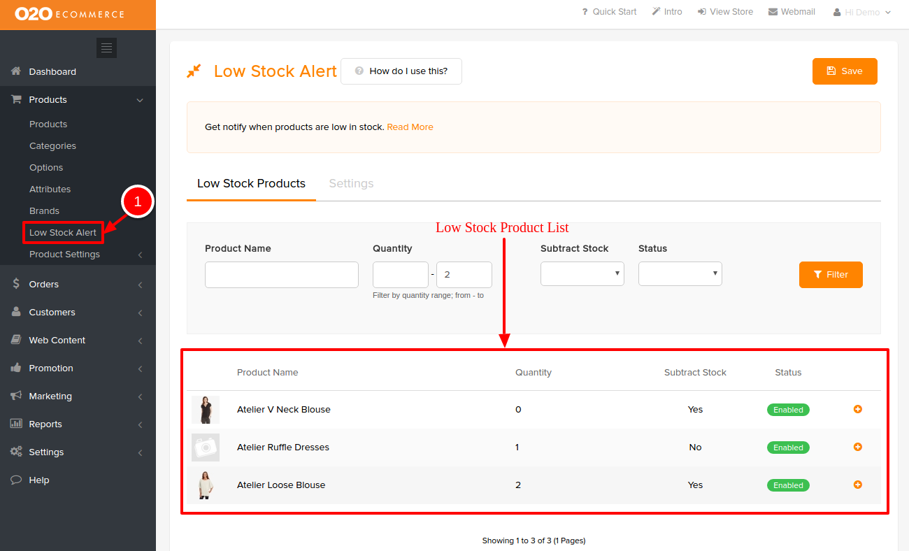 - Go to Products > Low Stock Alert